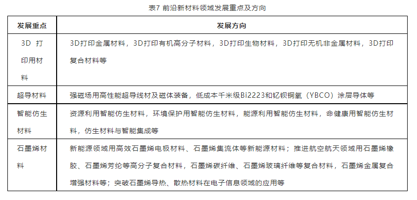前沿新材料领域发展重点及发展方向主要包括3D打印用材料、超导材料、智能仿生材料、石墨烯材料等(见表7)。