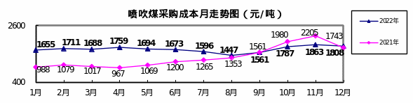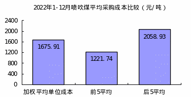 喷吹煤12月份加权平均折算成干基的采购成本为1808.31元/吨,环比下降54.28元/吨,降幅为2.91%。1—12月累计平均折算成干基的采购成本为1675.91元/吨,同比升高327.72元/吨,升幅为24.31%。