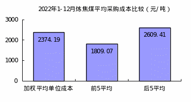 1—12月对标企业炼焦煤平均采购成本最低的前5家企业折算成干基的加权平均采购成本为1809.07元/吨,比对标企业平均采购成本低565.12元/吨,低于平均采购成本23.80%;而采购成本最高的5家企业的加权平均采购成本为2609.41元/吨,比对标企业平均采购成本高235.22元/吨,高于平均采购成本9.91%。