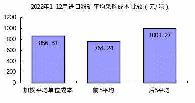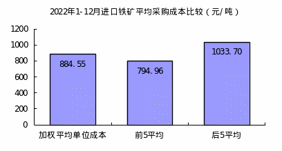 1—12月对标企业进口粉矿折算成62%品位的平均采购成本为856.31元/吨,成本最低的前5家企业的加权平均采购成本为764.24元/吨,比对标企业平均采购成本低92.07元/吨,低于平均采购成本10.75%;而采购成本最高的5家企业加权平均采购成本为1001.27元/吨,比对标企业平均采购成本高144.96元/吨,高于平均采购成本16.93%。