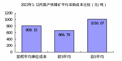 1—12月对标企业国产铁精矿折算成62%品位的平均采购成本为808.15元/吨,成本最低的前5家企业的加权平均采购成本为666.79元/吨,比对标企业平均采购成本低141.36元/吨,低于平均采购成本17.49%;而采购成本最高的5家企业的加权平均采购成本为1016.07元/吨,比对标企业平均采购成本高207.92元/吨,高于平均采购成本25.73%。