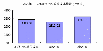 1—12月对标企业废钢平均采购成本最低的前5家企业的加权平均采购成本为2813.22元/吨,比对标企业平均采购成本低275.28元/吨,低于平均采购成本8.91%;而采购成本最高的5家企业加权平均采购成本为3399.61元/吨,比对标企业平均采购成本高311.11元/吨,高于平均采购成本10.07%。