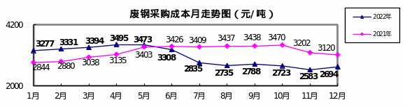 废钢12月份加权平均采购成本为2694.17元/吨,环比升高110.88元/吨,升幅为4.29%。1—12月累计平均采购成本为3088.50元/吨,同比下降151.21元/吨,降幅为4.67%。
