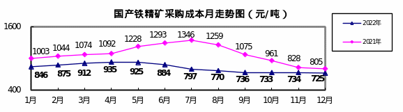 国产铁精矿(干基)12月份加权平均采购成本为725.42元/吨,环比下降8.82元/吨,降幅为1.20%。1—12月累计平均采购成本为822.84元/吨,同比下降290.02元/吨,降幅为26.06%。