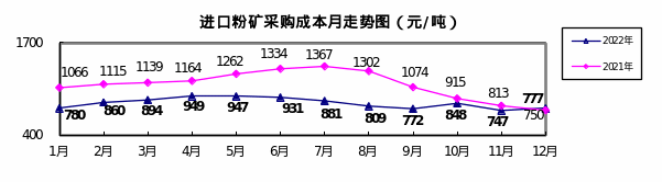 进口粉矿12月份加权平均采购成本776.55元/吨,环比升高29.40元/吨,升幅为3.94%。1—12月累计平均采购成本为841.30元/吨,同比下降268.07元/吨,降幅为24.16%。