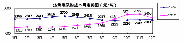 对标企业炼焦煤12月份加权平均折算成干基的采购成本为2282.61元/吨,环比升高40.83元/吨,升幅为1.82%。1—12月累计平均折算成干基的采购成本为2374.19元/吨,同比升高473.43元/吨,升幅为24.91%。